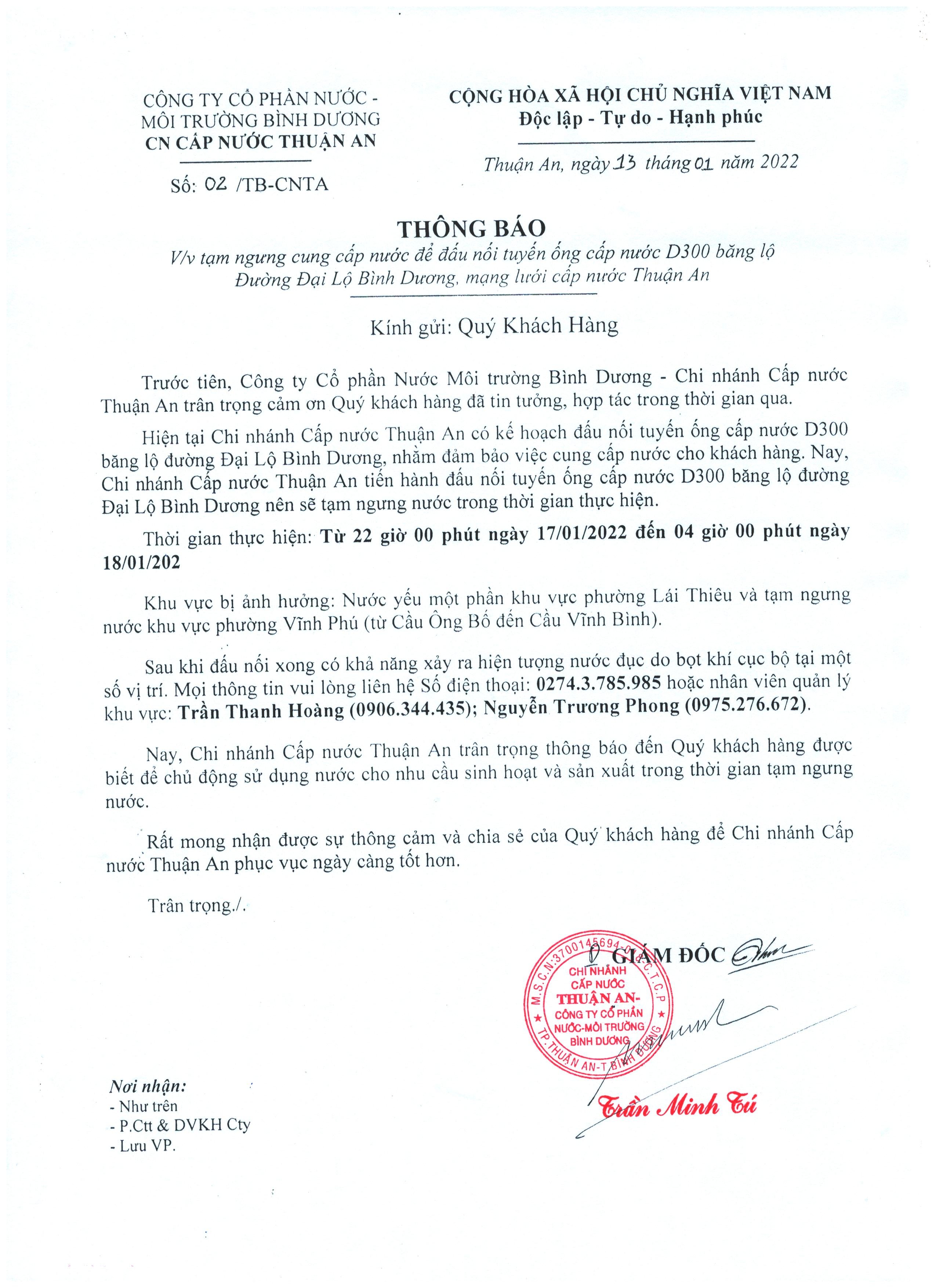 Tạm ngưng cấp nước khu vực Khu Liên Hợp: tuyến ống D150 bên phải đường Đại Lộ Bình Dương (đoạn từ...