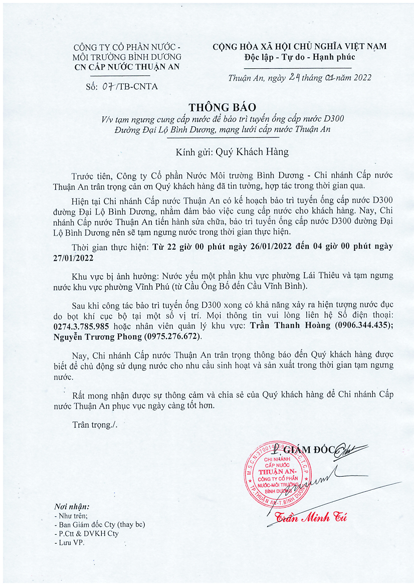 Tạm ngưng cấp nước khu vực Khu Liên Hợp: tuyến ống D150 bên phải đường Đại Lộ Bình Dương (đoạn từ...