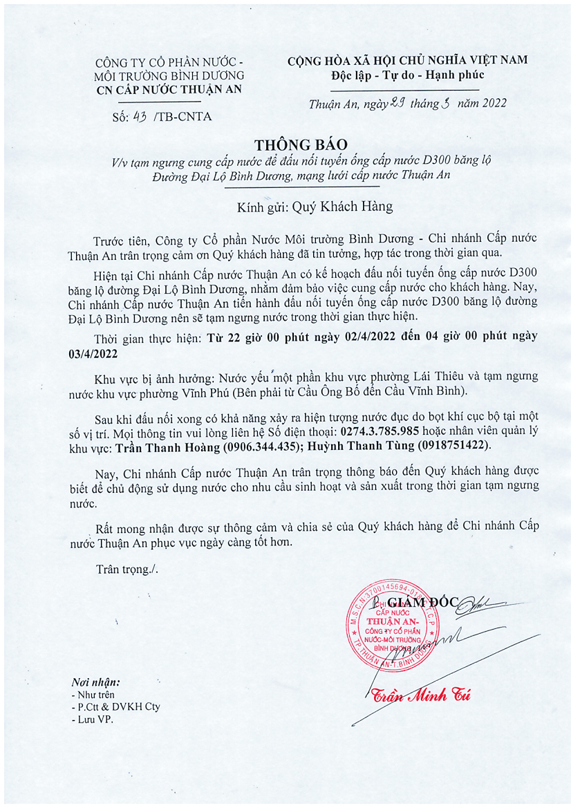 Tạm ngưng cấp nước khu vực Khu Liên Hợp: tuyến ống D150 bên phải đường Đại Lộ Bình Dương (đoạn từ...