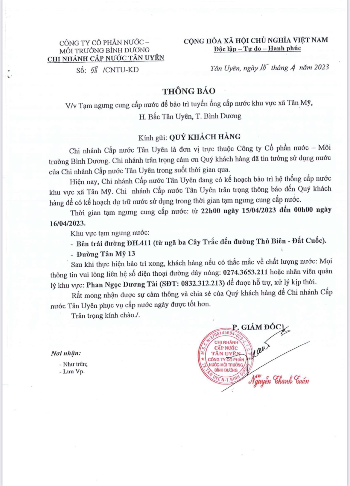 Tạm ngưng cung cấp nước khu vực xã Tân Mỹ, huyện Bắc Tân Uyên
