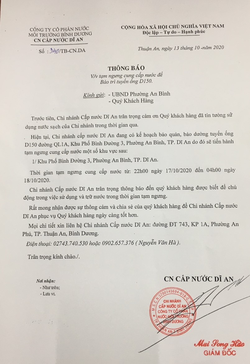 Tạm ngưng cung cấp nước KP Bình Đường 3, P. An Bình, TP. Dĩ An