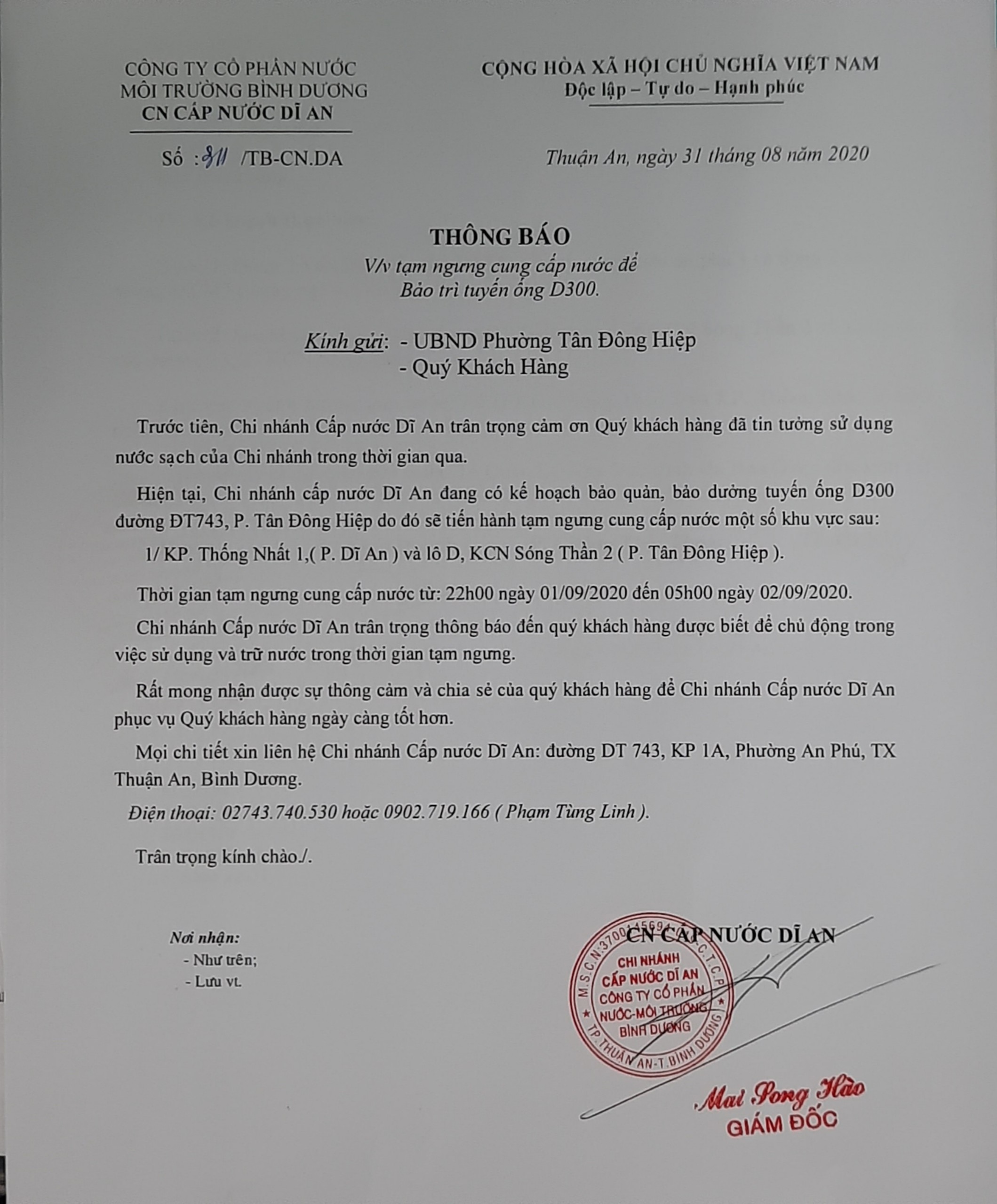 Tạm ngưng cung cấp nước KP Thống Nhất 1 (P. Dĩ An) và lô D, KCN Sóng Thần 2 (P. Tân Đông Hiệp)