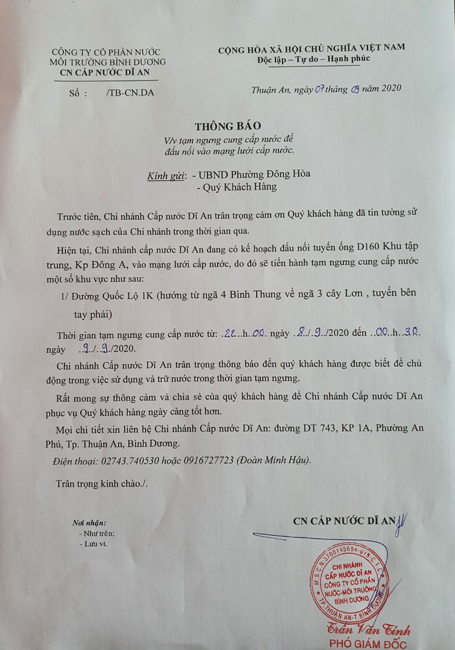 Tạm ngưng cung cấp nước P.Đông Hòa, Dĩ An