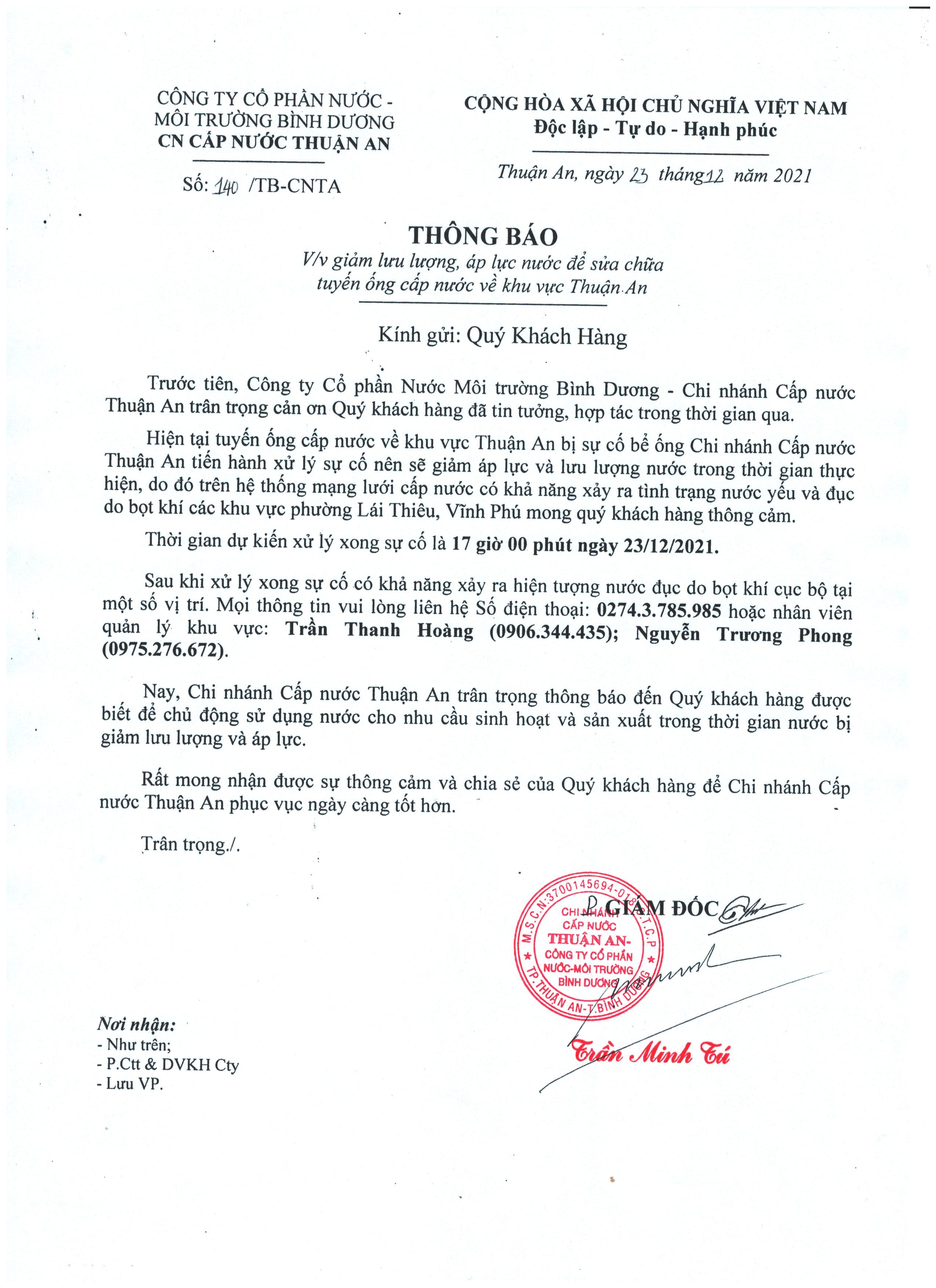Tạm ngưng cấp nước khu vực Khu Liên Hợp: tuyến ống D150 bên phải đường Đại Lộ Bình Dương (đoạn từ...