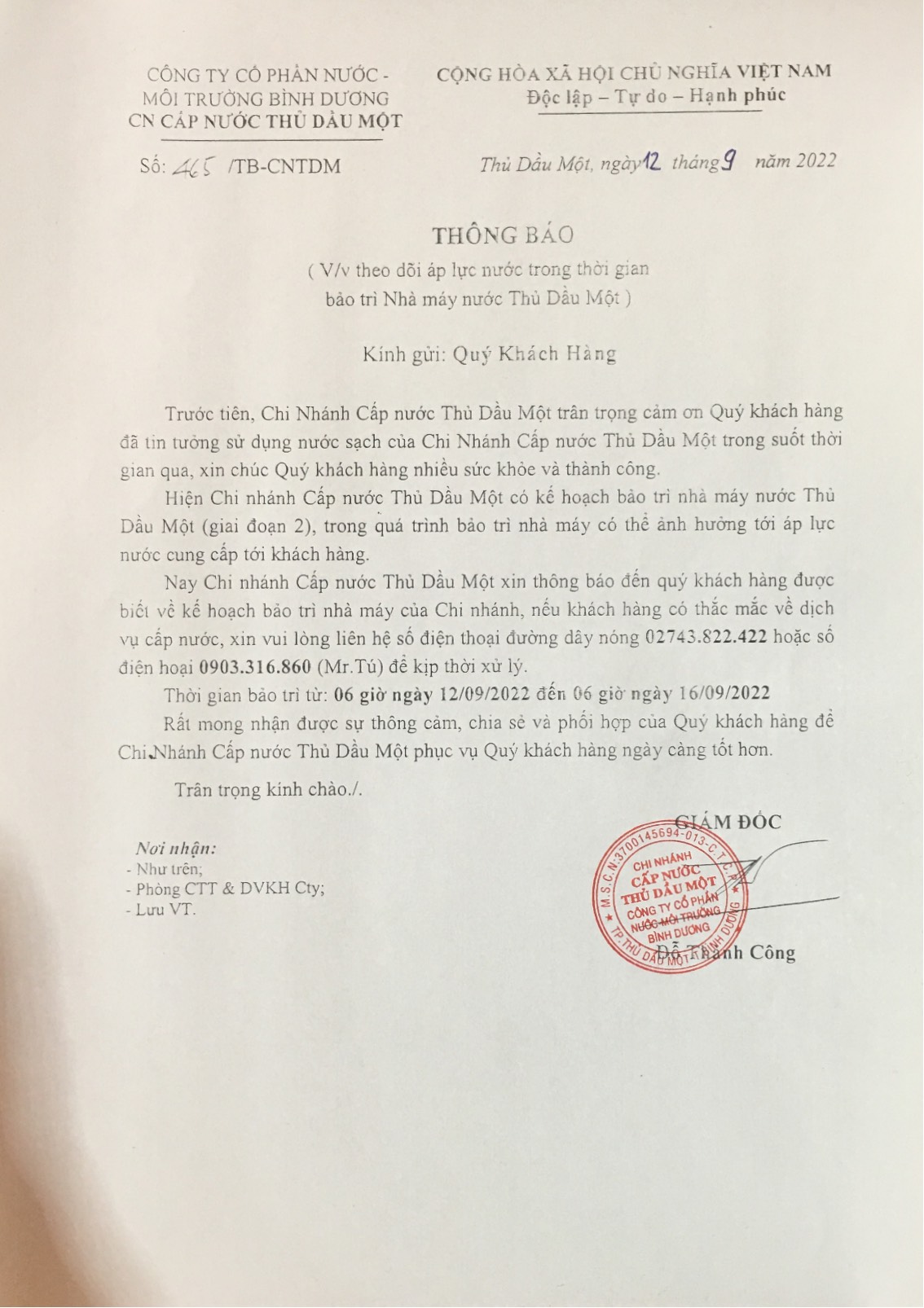 TB V/v theo dõi áp lực nước trong thời gian bảo trì Nhà máy nước Thủ Dầu Một