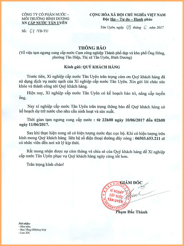 Thông báo Về việc tạm ngưng cung cấp nước Cụm công nghiệp Thành phố đẹp và khu phố Ông Đông, phường Tân Hiệp, Thị xã Tân Uyên, Bình Dương