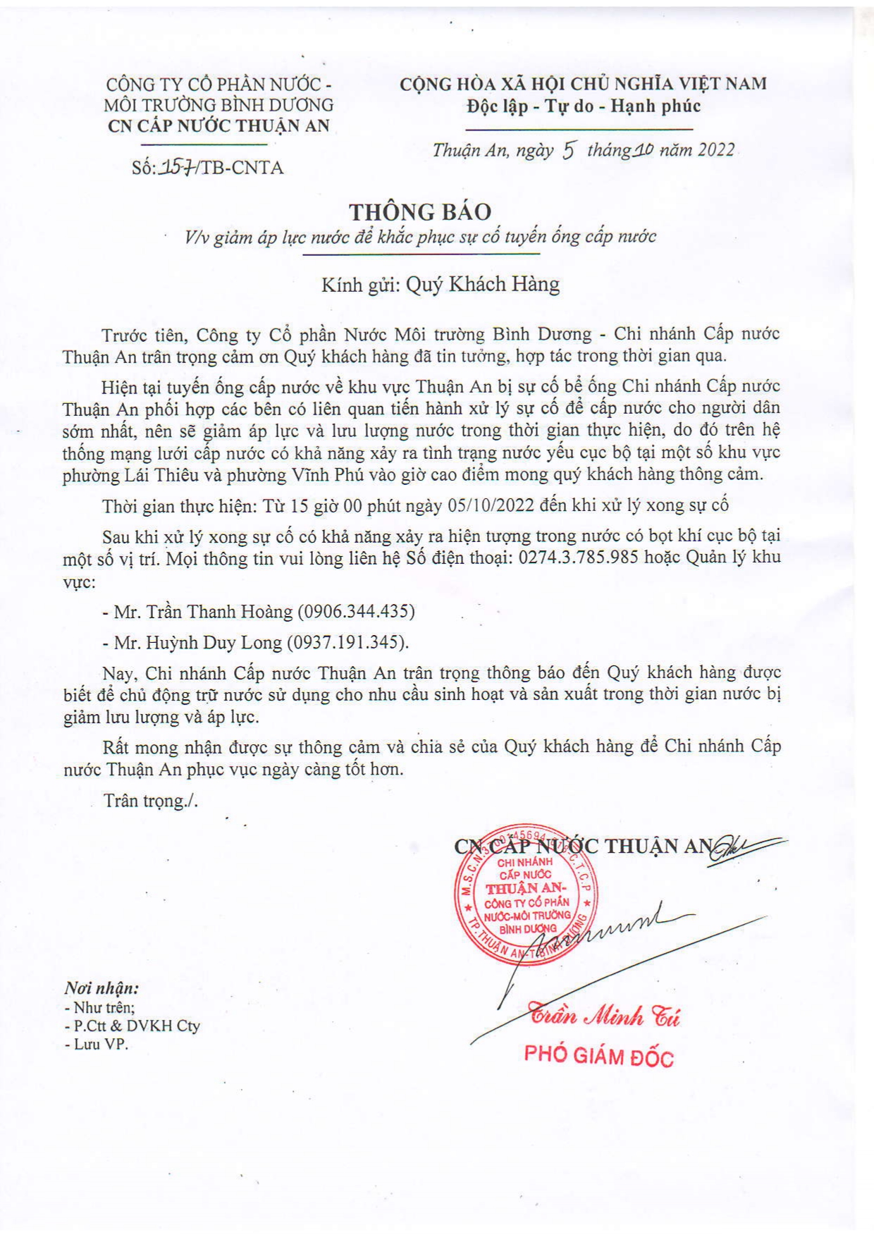 V/v giảm áp lực nước để khắc phục sự cố tuyến ống cấp nước khu vực Thuận An