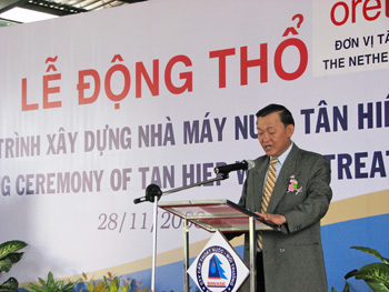 Đến dự lễ động thổ công trình xây dựng Nhà máy nước Tân Hiệp , được đón tiếp quý đại biểu: Ông Phạm Hoàng Hà – PCT UBND tỉnh BD, Ông Vũ Đức Thành - PCT HĐND tỉnh Bình Dương, Ông Ngô Hồng Quang cục trưởng cục hạ tầng đô thị - BXD, Ông Nguyễn Ngọc Điệp – Phó vụ trưởng Vụ Công nghiệp (Văn phòng CP), Ông Phạm Ngọc Thái – Cục phó Cục hạ tầng - GĐ BQLDA Hạ tầng KTĐT – BXD, Bà Phan Thu Hằng Vụ kinh tế đối ngoại - Bộ Tài chính, Bà Lê Phị Yến - Vụ kinh tế đối ngoại - Bộ Tài chính, Ông Jos Schellaars - Tổng lãnh sự quán Hà Lan tại TPHCM (To attend today ceremony, it is our great honour to see Mr. Jos Schellaars – Consulate General Embassy of Holland in HCM city).