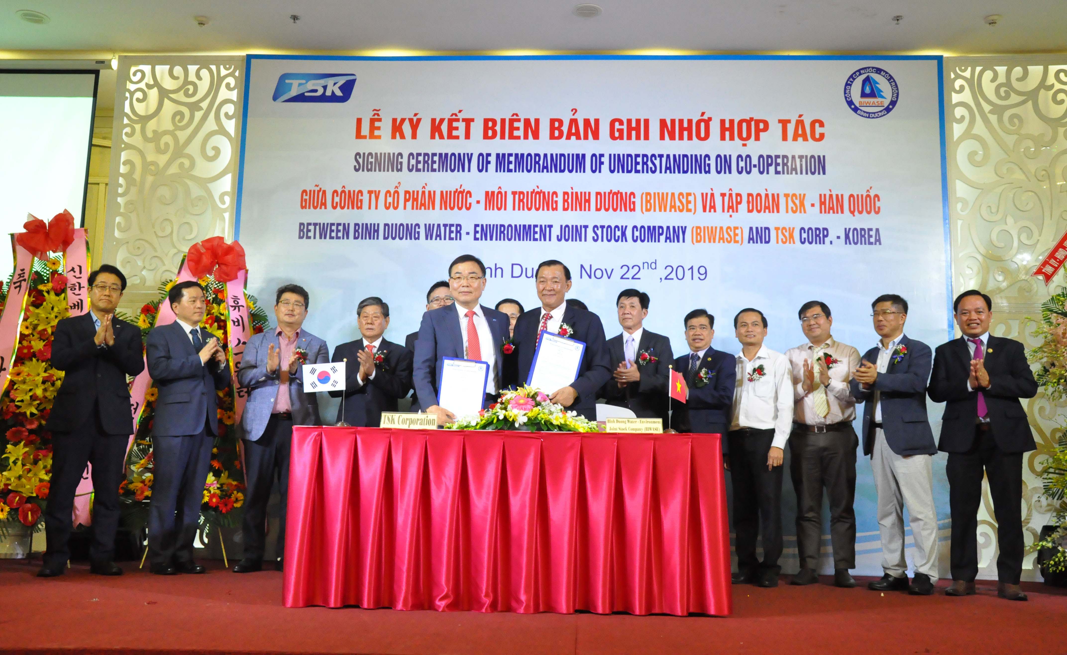 Ngày 22/11, ông Nguyễn văn Thiền-Chủ tịch HĐQT Công ty CP Nước-Môi trường Bình Dương (BIWASE) và ông Youngseok Kim-Chủ tịch HĐQT kiêm GĐ điều hành Tập đoàn TSK (Hàn Quốc) đã chính thức ký kết biên bản ghi nhớ (MOU) nhằm thiết lập mối quan hệ hợp tác đa phương,tìm hiểu các cơ hội kinh doanh liên quan đến lĩnh vực môi trường như: xử lý nước, quản lý chất thải, năng lượng tái tạo, khai thác đô thị và xử lý đất.