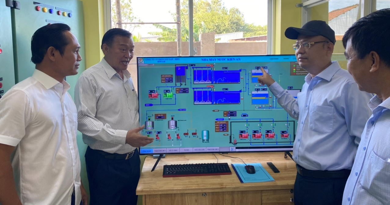 Ông Lương Văn Bạ (giữa) kiểm tra nhà máy nước Kiến An trước khi nhấn nút tại lễ phát nước