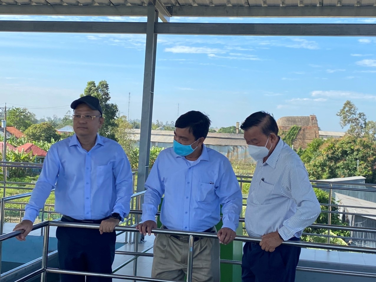 Ông Nguyễn Văn Thiền (thứ 2 từ trái sang) Chủ tịch HĐQT Công ty Biwase, ông Văn Kim Hùng Phong (bìa trái) giới thiệu công nghệ quản lý, vận hàng nhà máy.