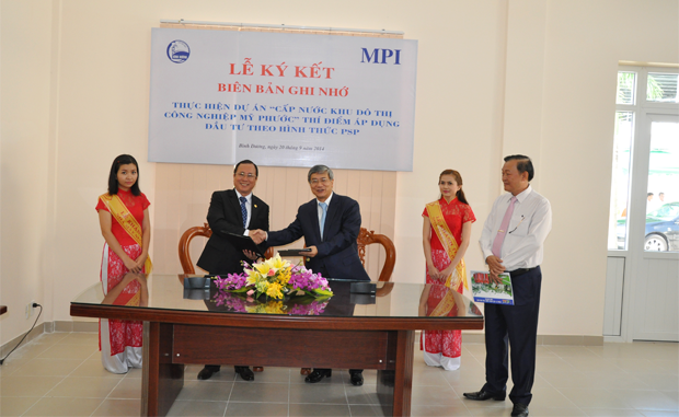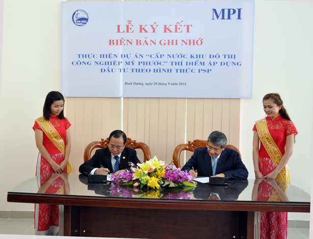 Sáng ngày 20/9/2014, hòa chung không khí vui mừng của buổi lễ khánh thành nhà máy nước Dĩ An 2, công suất 50.000m3/ngđ, ông Trần Văn Nam, Phó Chủ tịch thường trực UBND tỉnh Bình Dương và ông Trần Tường Lân, Vụ trưởng vụ hạ tầng kết cấu đô thị, Bộ Kế hoạch Đầu tư đã cùng nhau ký kết Biên bản ghi nhớ thực hiện dự án “Cấp nước khu đô thị công nghiệp Mỹ Phước”, thí điểm áp dụng đầu tư theo hình thức PSP (Private Sector Participation).
