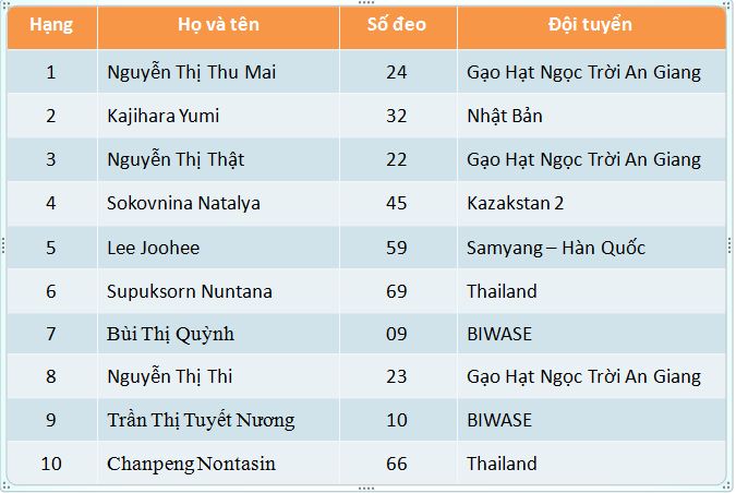 Giải xe đạp nữ quốc tế Bình Dương mở rộng lần thứ VII - Năm 2017: Kết quả chung cuộc Chặng 5: TP.Nha Trang đi TP.Phan Rang-Tháp Chàm dài 105 km .