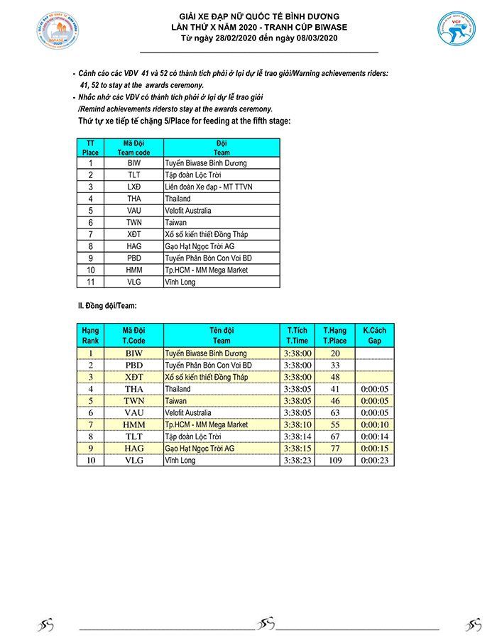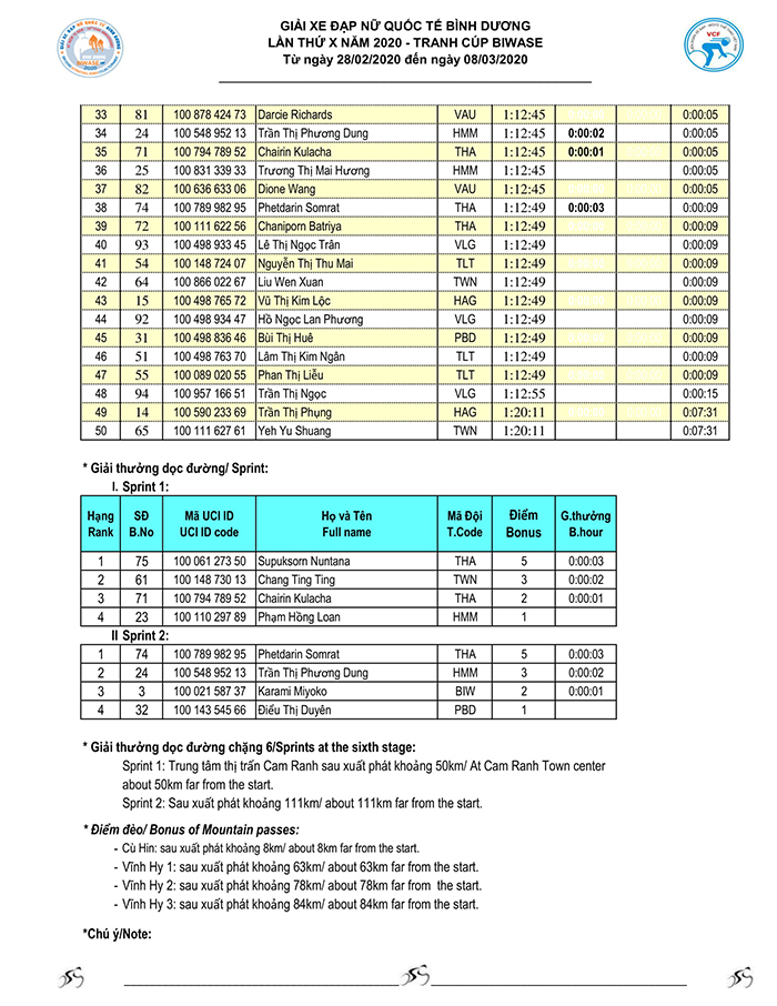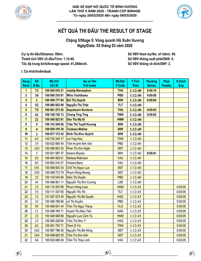 Kết quả chặng 05 - Giải xe đạp nữ Quốc tế Bình Dương tranh cúp BIWASE lần thứ X-Năm 2020