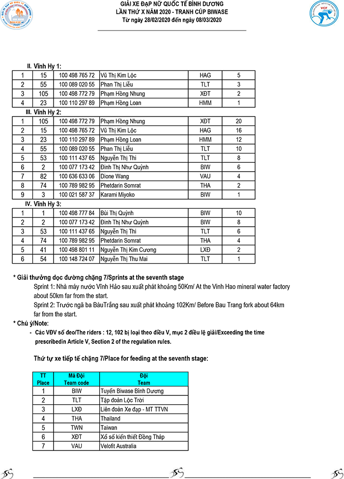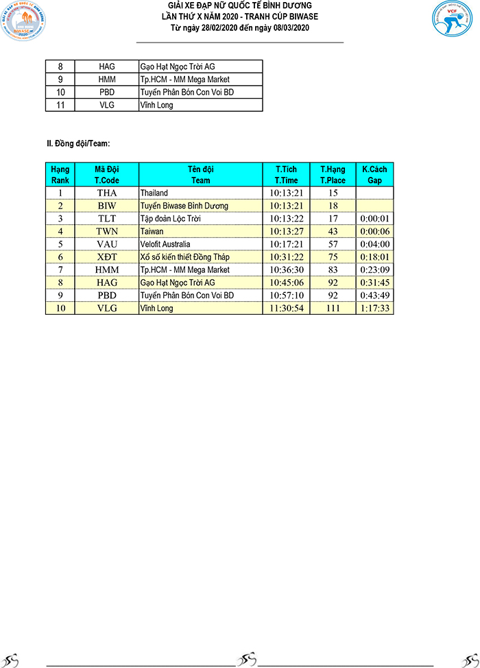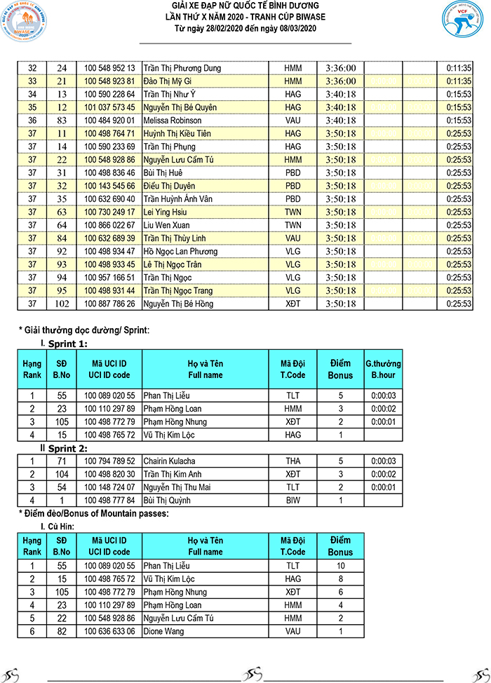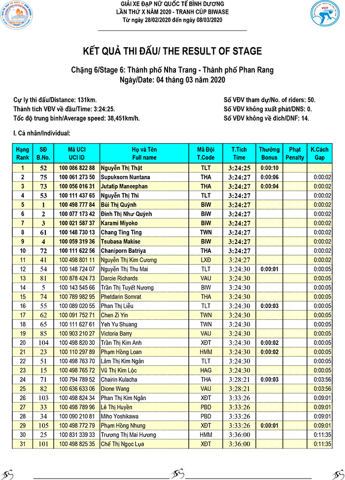 Kết quả chặng 06 - Giải xe đạp nữ Quốc tế Bình Dương tranh cúp BIWASE lần thứ X-Năm 2020