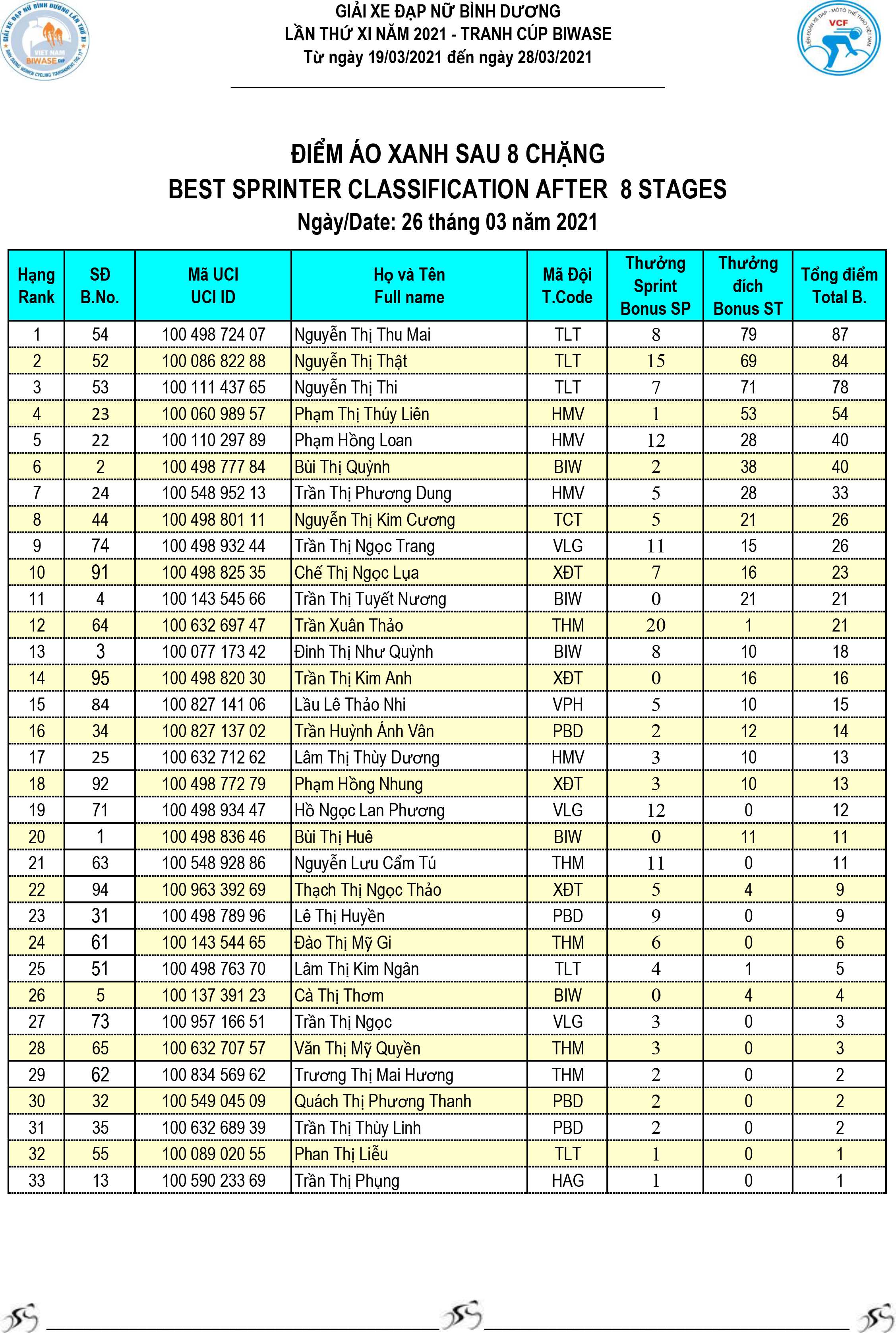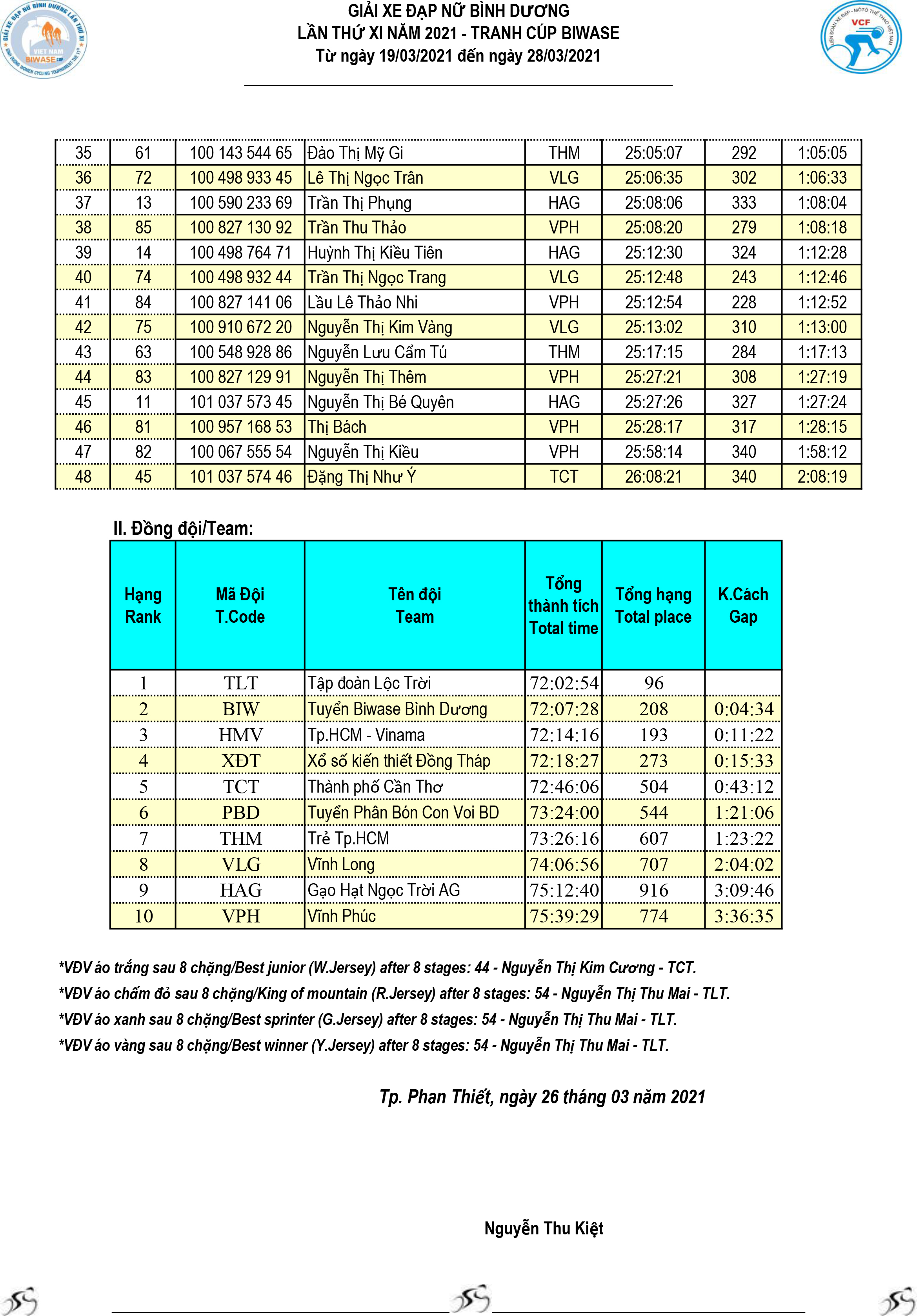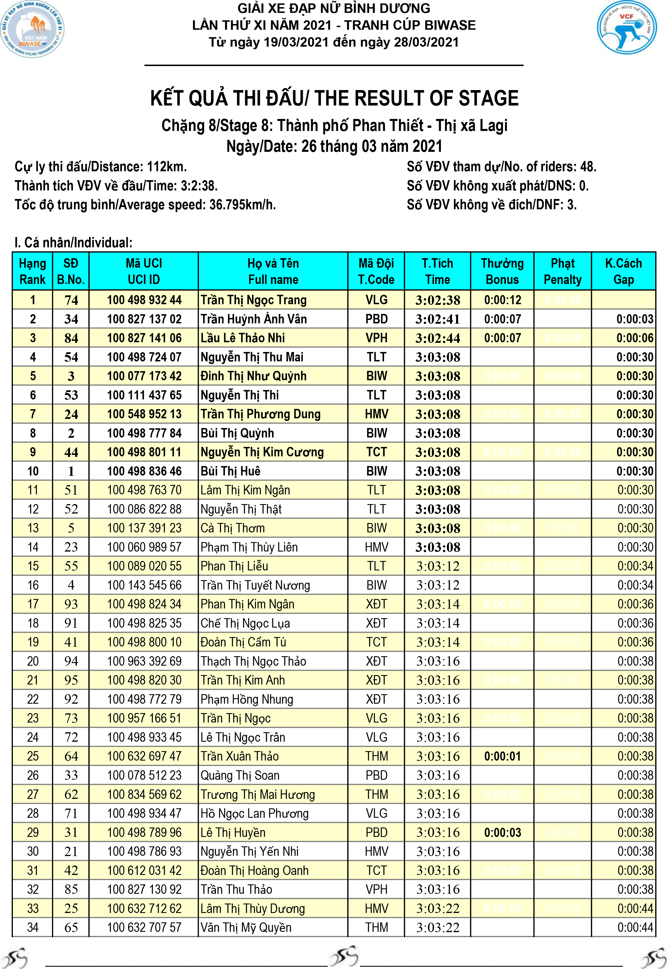 Kết quả chặng 08 - Giải xe đạp nữ Quốc tế Bình Dương tranh cúp BIWASE lần thứ XI-Năm 2021