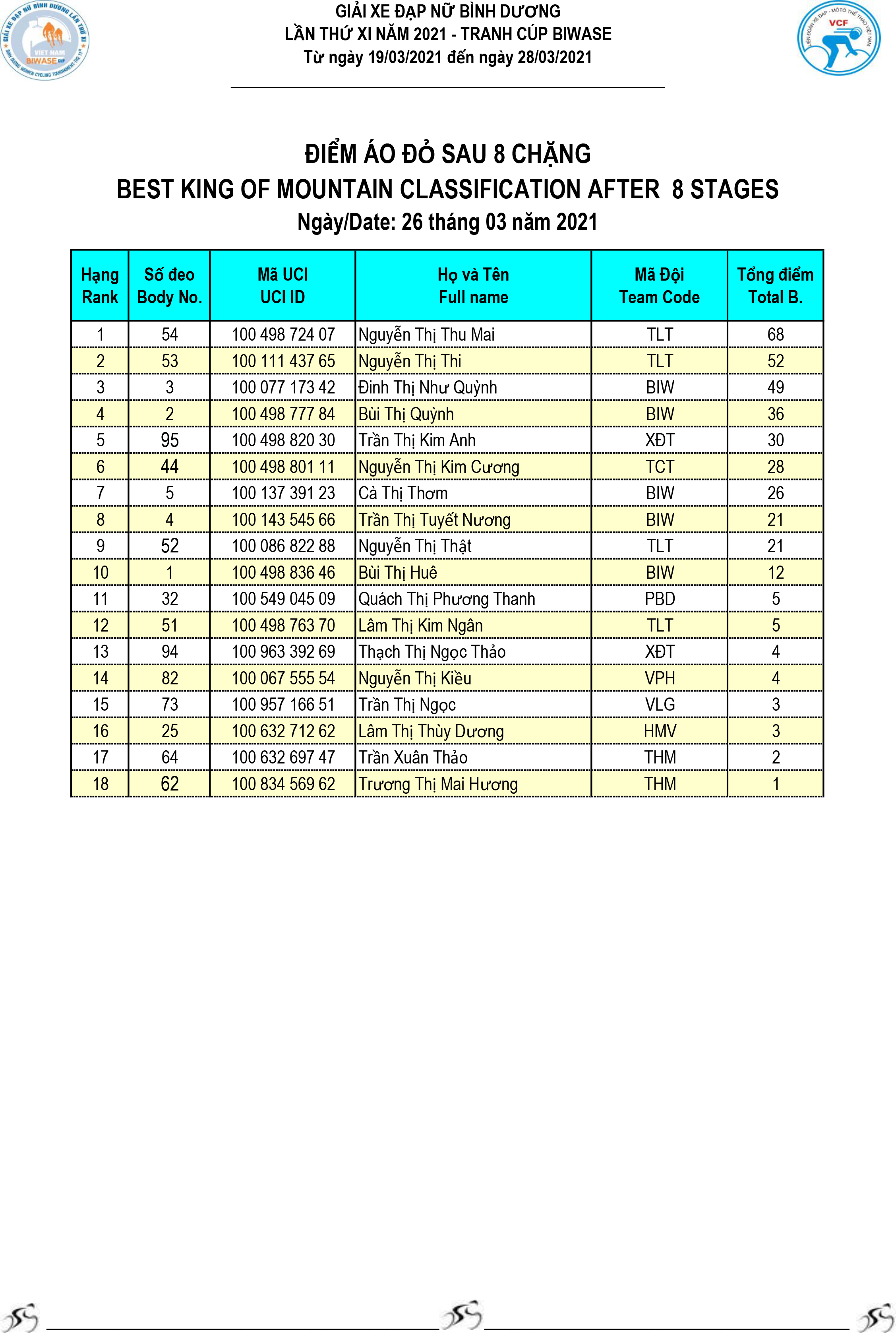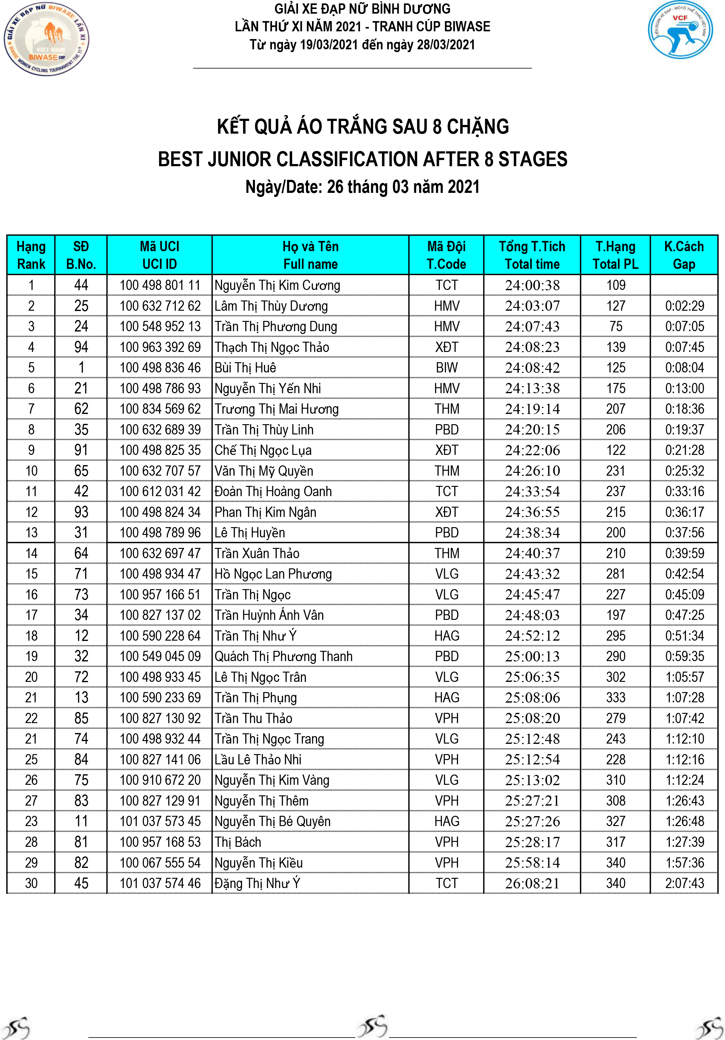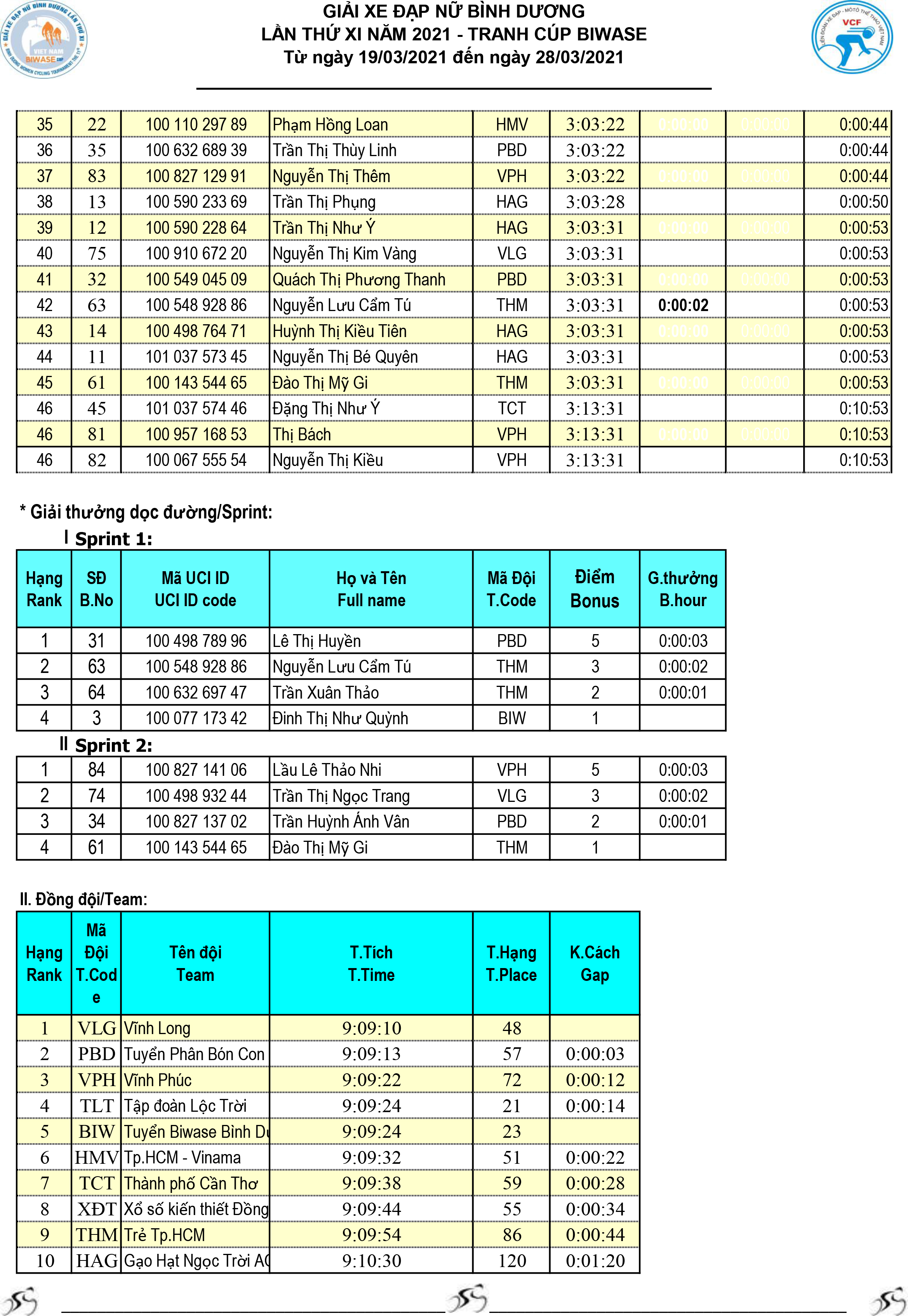 Kết quả chặng 08 - Giải xe đạp nữ Quốc tế Bình Dương tranh cúp BIWASE lần thứ XI-Năm 2021
