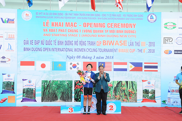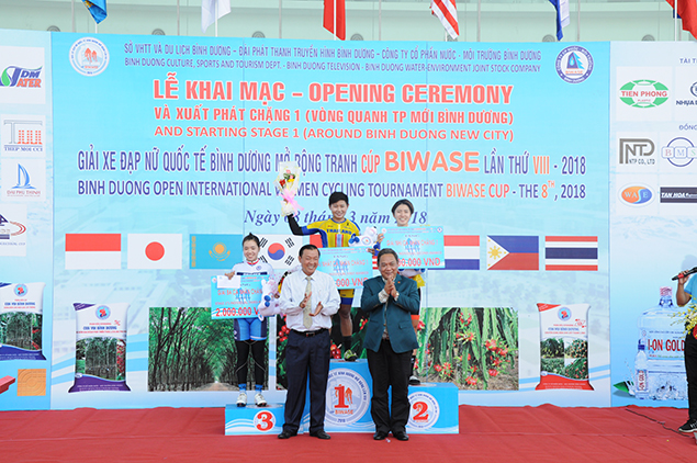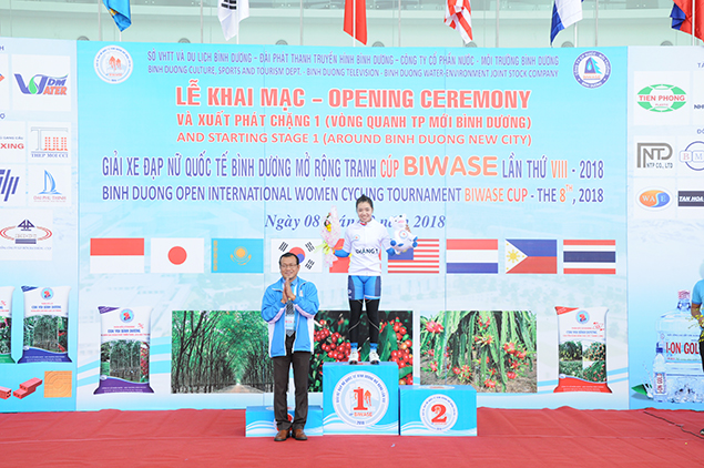 Trao giải áo trắng chặng 1 - Vận động viên Phạm Thị Xuân Hồng - Số đeo 34 - Đội Gạch - Phân bón con voi Bình Dương