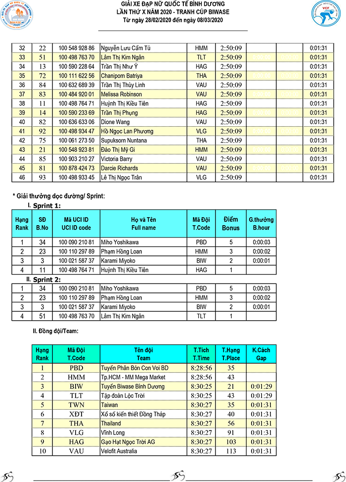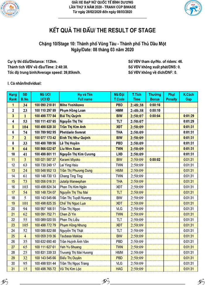 Kết quả chặng 10 - Giải xe đạp nữ Quốc tế Bình Dương tranh cúp BIWASE lần thứ X-Năm 2020