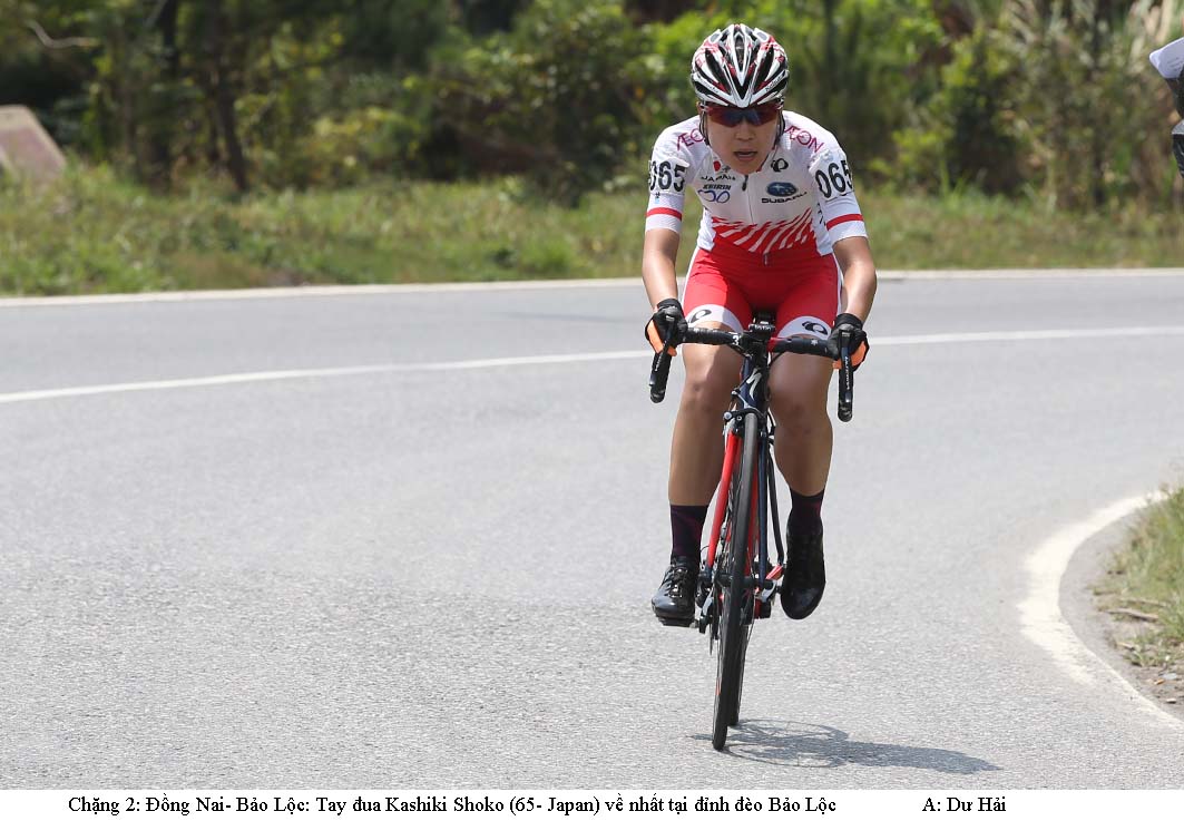 Trên đỉnh đèo Bảo Lộc tay đua tay đua Kashiki Shoko (Japan) một mình cán đích trước tiên xứng đáng đoạt chiếc áo chấm đỏ “Nữ hoàng leo núi”, về thứ hai và ba là hai tay đua Son Eunju (Samyang) và Makisa (Biwase).