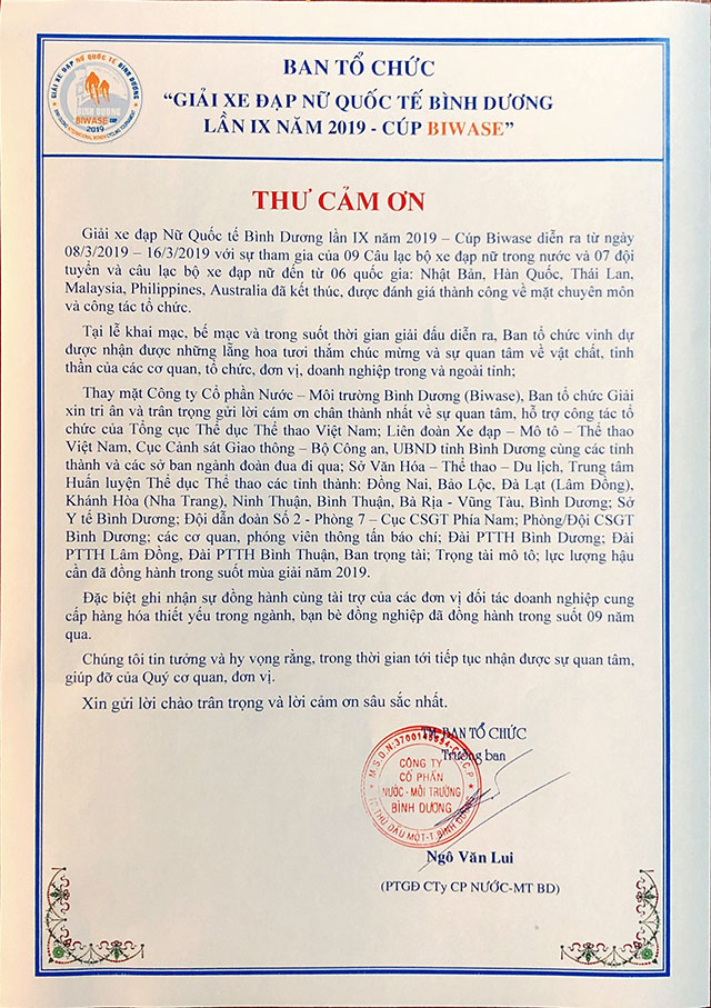 Thư cảm ơn từ Ban tổ chức "Giải xe đạp nữ quốc tế Bình Dương lần IX năm 2019 - Cúp BIWASE"
