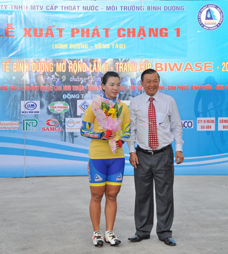 Sáng nay, 9/3, tại sân thể thao công ty Biwase diễn ra lễ trao áo vàng và xuất phát chặng đua đi từ Bình Dương đến Bà Rịa – Vũng Tàu với chiều dài 120 km. Trước khi xuất phát là phát biểu của ông Nguyễn Văn Thiền – Tổng Giám đốc Công ty Biwase – nhà tài trợ chính của giải, sau đó áo vàng được trao cho VĐV xuất sắc có thành tích 4’2’37% là Nguyễn Thùy Dung.