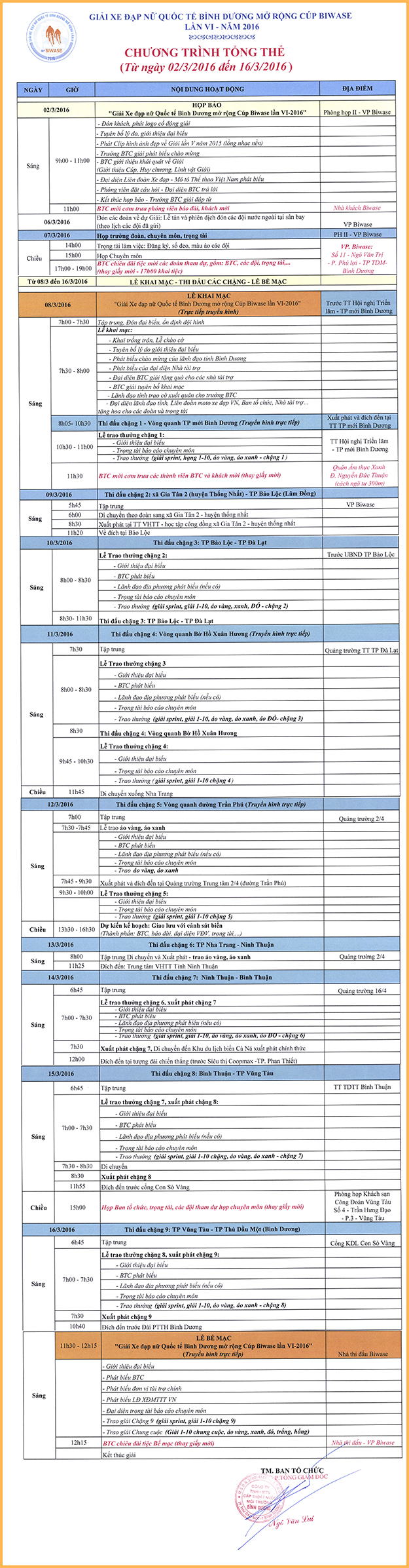 Chương trình tổng thể - Giải xe đạp nữ quốc tế Bình Dương mở rộng cúp BIWASE lần VI - năm 2016