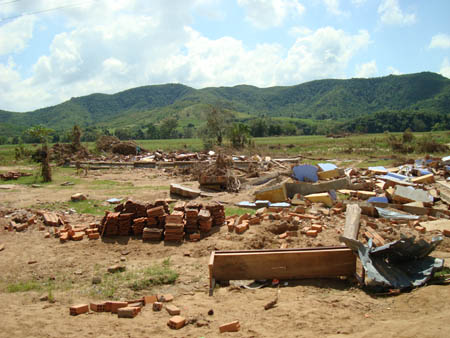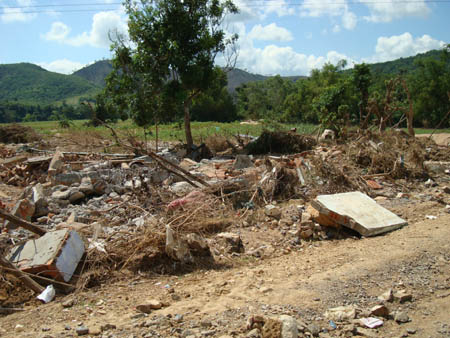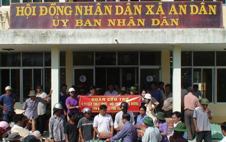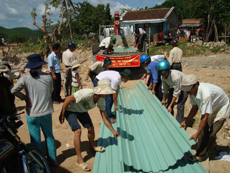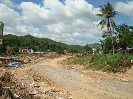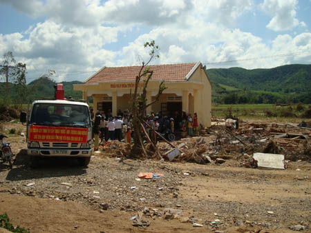 Vượt hơn 600km đường bộ, sáng ngày 13/11, đoàn đã đến 2 xã An Dân và Xuân Quang 2 thuộc huyện Đồng Xuân - Tỉnh Phú Yên, là một trong những địa phương chịu thiệt hại nặng nề nhất sau trận bão lũ vừa qua, đâu đâu cũng một cảnh hoang tàn, tang thương đến nát lòng, chúng tôi chứng kiến toàn cảnh sức tàn phá kinh hoàng của cơn thiên tai vừa hoành hành, vết lũ kinh hoàng đánh dấu bởi những rác rưởi, rơm rạ trôi theo lũ vắt ngang thân cầu đường sắt, dây điện, những bụi tre trốc gốc nằm chông chênh, những bãi đất trống còn ngổn ngang gạch.