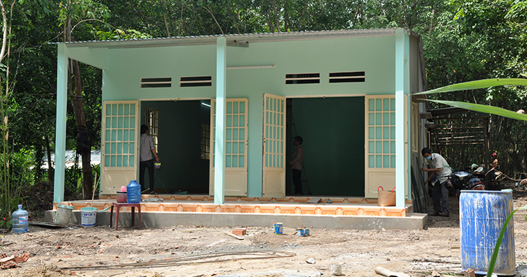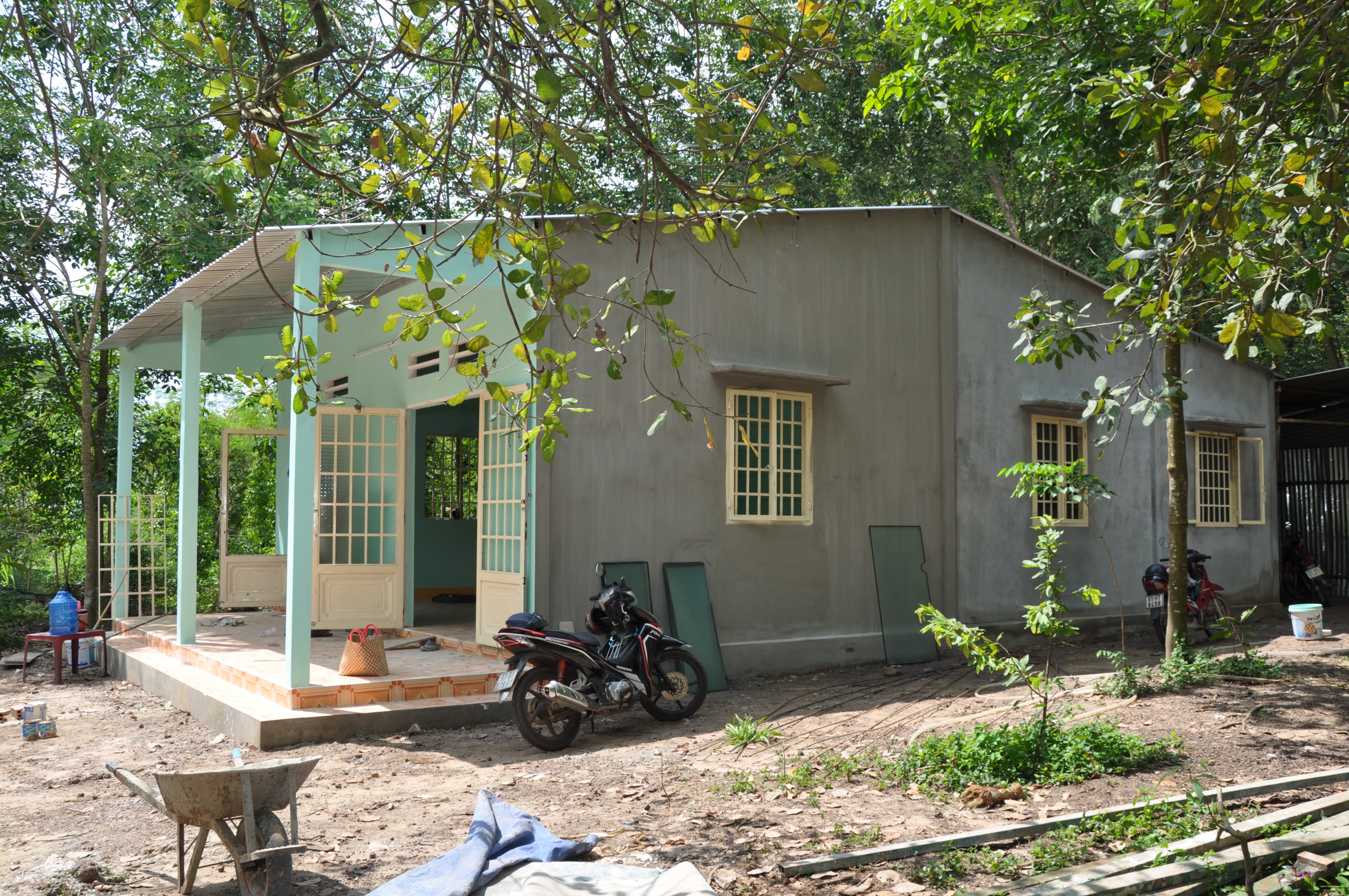 Căn nhà đầu tiên được xây dựng làm mẫu cho hộ bà Lâm Thị Âu Lang, dân tộc Khơme, cư trú tại xã Nha Bích, huyện Chơn Thành, tỉnh Bình Phước. Căn nhà được xây dựng trên diện tích 100m2, kết cấu móng xây gạch, cột bê tông cốt thép đúc sẵn, tường xây gạch quét vôi, mái lợp tole, xà gồ thép, nền lát gạch, cửa đi và cửa sổ khung sắt kính, với tổng kinh phí ≈ 100 triệu đồng/căn (mức hỗ trợ thường là 60 triệu đồng/căn), sẽ được bàn giao đưa vào sử dụng vào tháng 8 này.