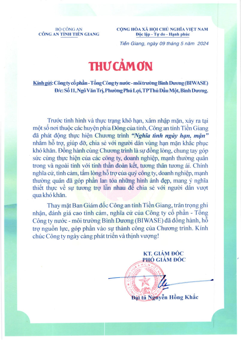 THƯ CẢM ƠN CỦA CÔNG AN TỈNH TIỀN GIANG