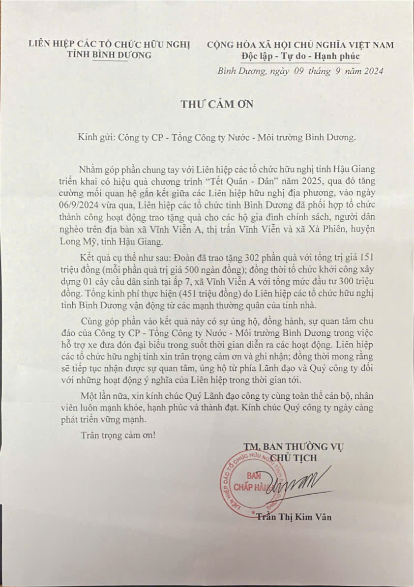 THƯ CẢM ƠN CỦA LIÊN HIỆP CÁC TỔ CHỨC HỮU NGHỊ TỈNH BÌNH DƯƠNG