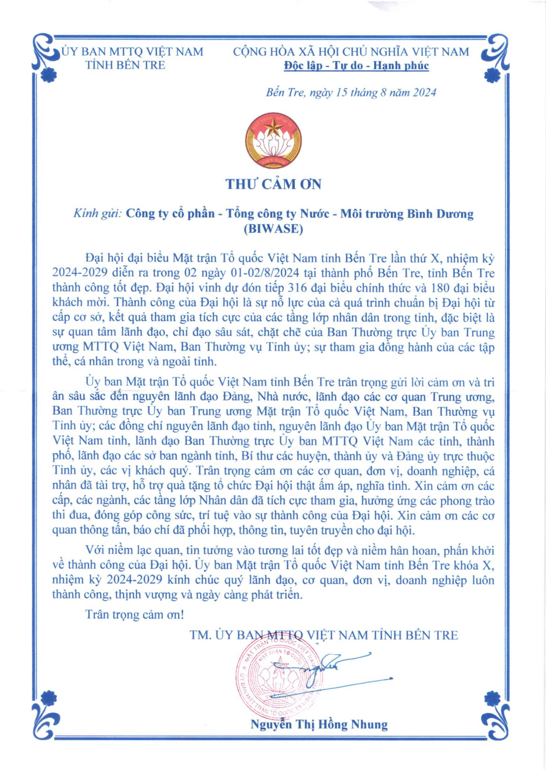 THƯ CẢM ƠN CỦA ỦY BAN MTTQ VIỆT NAM TỈNH BẾN TRE